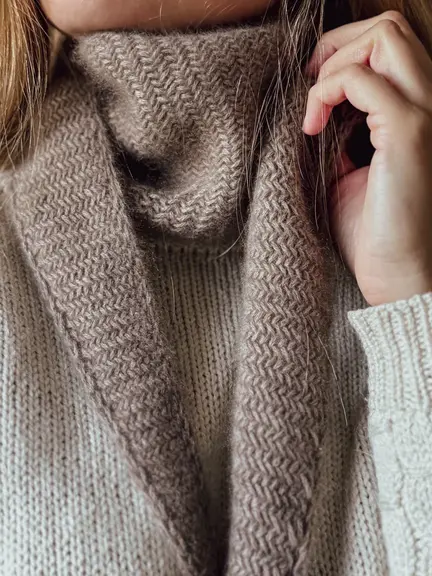 Prøv dig frem med pind 5,5-6,5 mm for at få den bedste struktur. Jeg har her benyttet pind 6 mm. Bemærk, at pindestørrelsen er stor i forhold til garnets tykkelse, da sildebensmønsteret ellers bliver meget stramt og fast. Jeg anbefaler at gå ca. 2 mm op i forhold til garnets anbefalede pind.