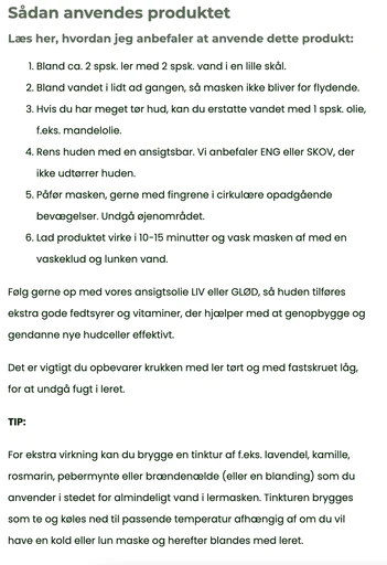Lermasken påføres enten som kold eller varm, alt efter behov og masseres blidt ind i huden. De eksfolierende hybenkerner har en god skrubbeeffekt. Masken stivner let og efter afvaskning, føles huden opstrammet og frisk.