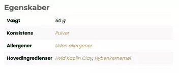 Ved anvendelse af lermasken 1-2 gange om ugen, kan du forvente at din hud bliver blød og får et silkeagtig finish med formindskede porrer og mere ensartet struktur. Masken gør huden mere klar og renser den for overskydende olie, skidt og forurening. Din hud vil desuden få bedre udnyttelse af din daglige ansigtspleje, da virkestofferne i f.eks. din ansigtsolie kan arbejde effektivt i dybden.
