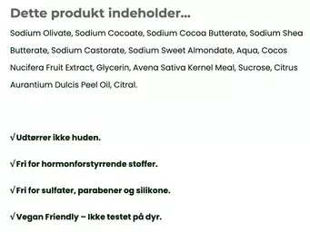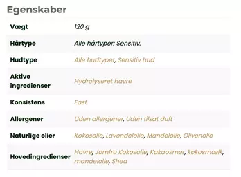 Shampoobaren er lavet i hånden på en gammeldags koldrørt metode, hvilket betyder at sæben bevarer mange af sine gode egenskaber, samt er 100% naturlig – den indeholder kun forsæbet olier og smør, kokosmælk, sukker for ekstra lækkert skum og dansk havre. Basisolierne er den bedste olivenolie, jomfru kokosolie, mandelolie, sheasmør, kakaosmør. Alle olierne er koldpressede og certificerede økologiske.