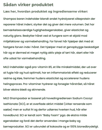 MILD shampoobar har en ruflet overflade, der gør det nemt at fordele sæben i håret. Skummet er tykt og cremet og efterlader håret blødt, rent og skinnende.