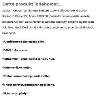 Dit hår vil føles rent, blødt og skinnende – fuld af liv og glans efter få anvendelser. Baren er specielt formuleret til at rense effektivt, men mildt og nænsomt, samtidig med at håret bliver fugtet og hovedbunden holdes sund og ren. Mange af mine kunder fortæller at de slet ikke behøver at anvende balsam mere, da shampoobaren er så fugtgivende.