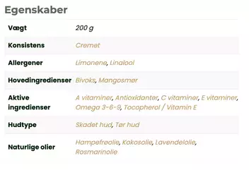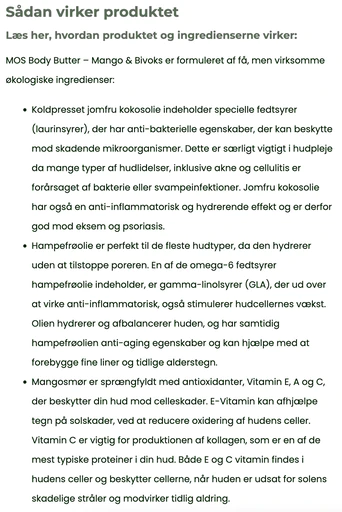 MOS Body Butter - Mango & Bivoks er en økologisk kropscreme, der er lavet af de bedste og mest fugtgivende ingredienser. Vores ekstra fugtgivende kropssmør kan anvendes på hele kroppen, selv de tørre hårspidser har godt af dette lille fugtmirakel. Cremen er formuleret med kun 6 kraftfulde ingredienser, der nærer og fugter huden optimalt: Økologisk kokosolie, hampefrøolie, mangosmør, bivoks, lavendelolie og naturlig E-vitamin.