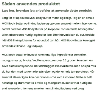 Brug gerne vores MOS Body Butter hver dag i din daglige hudplejerutine. Huden bliver mere elastisk, blød og får en sund ensartet finish.