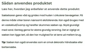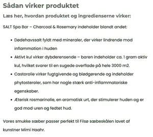Sæben er naturlig hård grundet det høje indhold af salt, hvilket gør den ideel i badet og bruseren, da den ikke bliver blød og flyder ud. Skummet er tykt og cremet og baren eksfolierer blidt mod huden, samt har en let duft af rosmarin. Det er den perfekt spa bar!