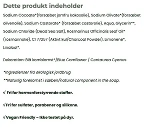 Nordsøen - Salt sæbe med rosmarin og aktivt kul laves ved at mikse kvalitetsolierne med kaustisk soda og vand fra Blåbjerg Skov, skånsomt ved lave temperaturer og herefter tilsættes castorolien, dødehavssalt og æterisk olie. En del af sæbemassen tages fra og det naturlige ler tilsættes. De to farvede sæbemasser hældes i træforme og smukke mønstre dannes i sæben så det ligner marmor. Toppen pyntes med pink Himalaya salt og tørrede kornblomster og efter ca. 4 timer skæres sæberne ud i hånden og sættes til at modne i op til 4 uger – ligesom en god ost eller vin. Herefter pakkes de smukke dekorative sæber i bæredygtigt cellofan, med tang fra den danske vestkyst. Posen bevarer sæbens kvalitet og virker samtidig som en smuk indpakning, hvor sæbens smukke mønstre kan ses, sammen med den håndhøstede tang. Perfekt som gave!