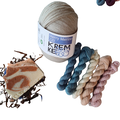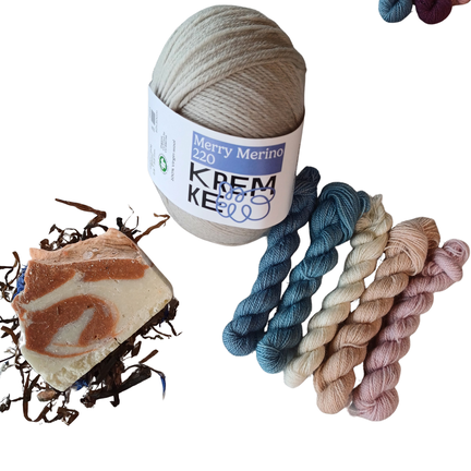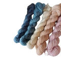 5 dukker plantefarvet, blødt uldgarn ca. 1000m/100g, 40m i hver dukke. I de viste farver